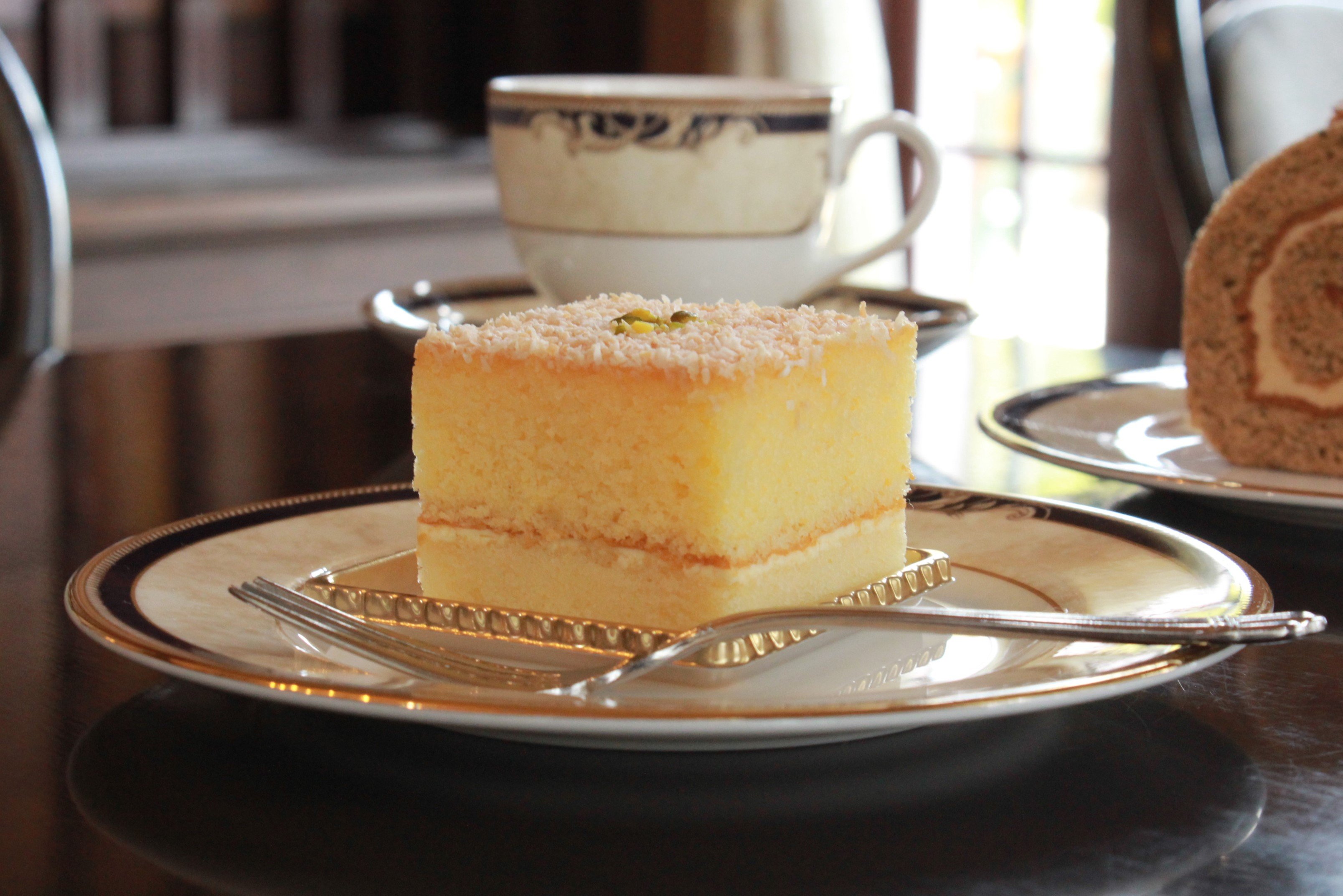 レモンシロップがたっぷりしみこんだスポンジ生地でレモンクリームをサンドし、表面はココナッツのローストとピスタチオでシンプルに仕上げています。