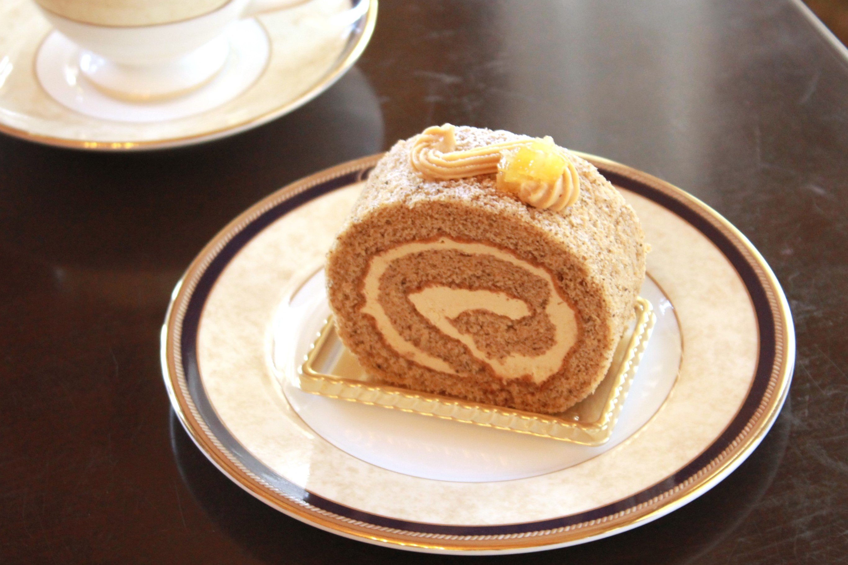 生地には細かく粉砕した茶葉を加え、同じ茶葉を煮出して作ったバタークリームを巻き込んでいます。トッピングにはレモンピールを。