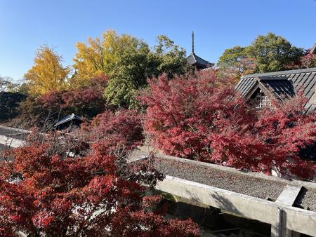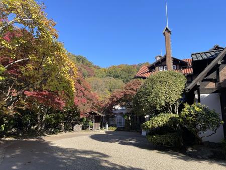 青い空と黄金色のイチョウ、紅いモミジが出迎えてくれます。