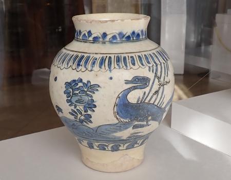 イスラム教の礼拝堂モスクの建築タイルをイメージして作られた、ブルーの展示ケースが目を引きます。