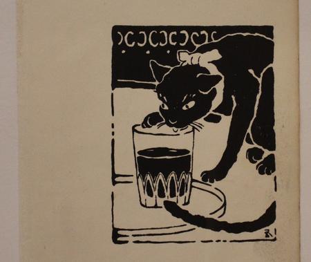 開催中の企画展「くらしに花咲くデザイン ―大正イマジュリィの世界」では、たくさんのグラフィックデザインやイラストレーションの作品をご覧いただけます。順路に沿って、今回は山本記念展示室から、かの有名な猫の姿をご紹介します。